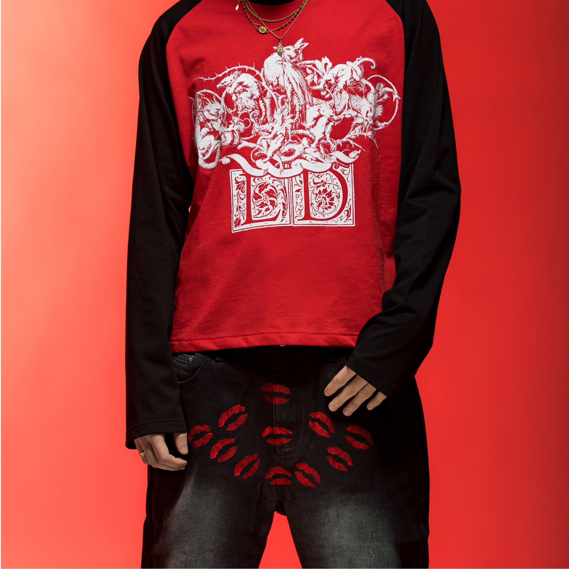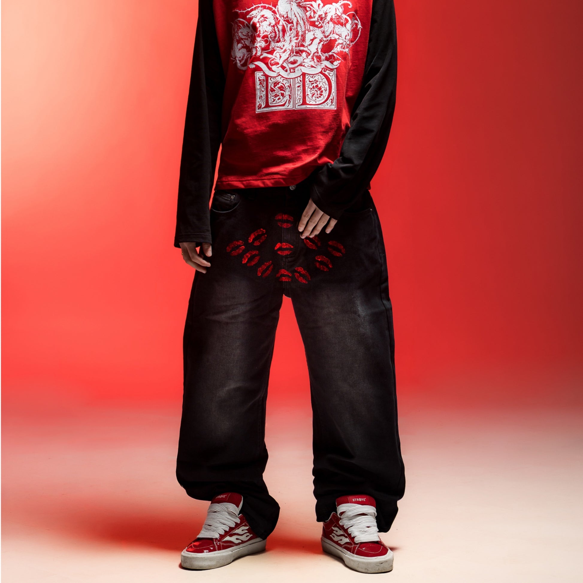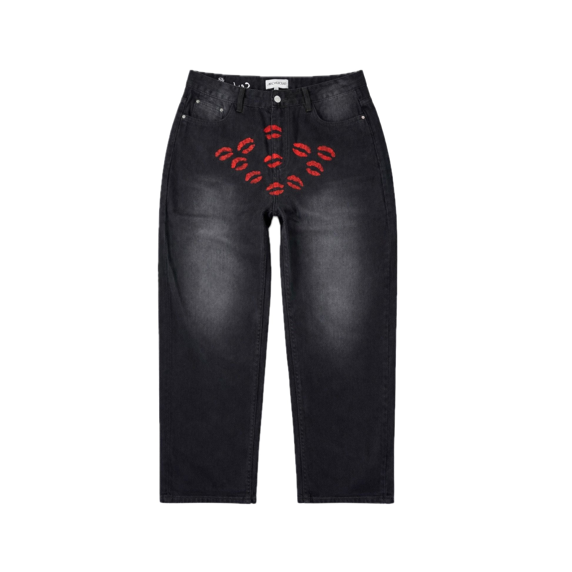 DETAILS: faded black wash with used effect, hand-painted red lips graphic on front, branded button and covered zip closure, structured waist with belt loops, 5-pocket design with metal rivets, light whiskering on thighs.