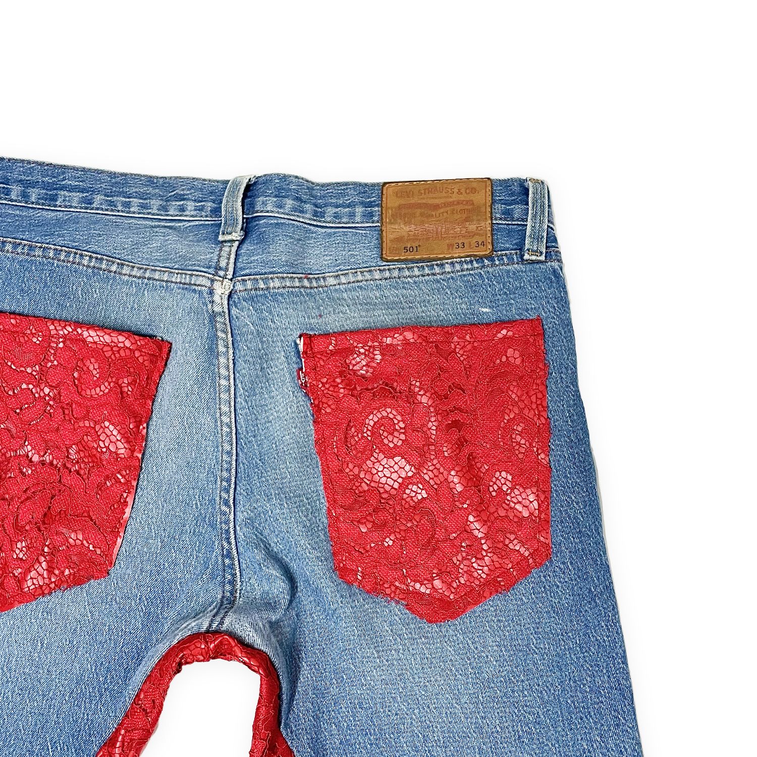 Pantalone 4 tasche dalla linea dritta. Chiusura con zip coperta. Realizzato in denim con inserti in pizzo rosso, classico segno riconoscitivo del brand. I baci nella zona centrale dei pantaloni sono caratteristici di questo modello eccentrico e riconoscibile.